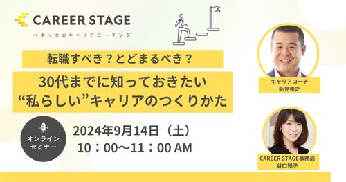 “満足度98%” のベネッセのキャリアコーチング【CAREER STAGE】では、9月14日(土)AM10:00から、『転職すべき? とどまるべき? 30代のうちに知っておきたい “私らしい” キャリアのつくりかた』と題して無料のオンラインセミナーを開催します! 「いまの仕…