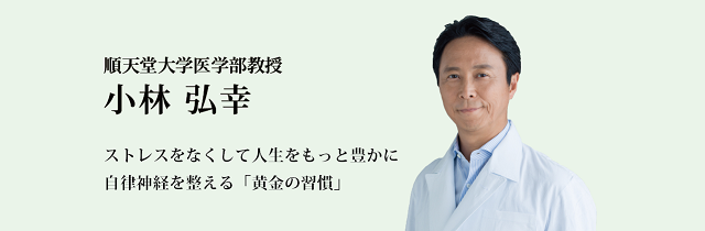 【プロフィール】 小林弘幸(こばやし・ひろゆき) 1960年、埼玉県に生まれる。順天堂大学医学部教授。日本体育協会公認スポーツドクター。順天堂大学医学部卒業後、1992年に同大学大学院医学研究科修了。ロンドン大学付属英国王立小児病院外科、トリニティ大学付属医学研究センター、アイルランド国立小児病院外科での勤務を経て、順天堂大学小児外科講師・助教授を歴任。国内における自律神経研究の第一人者として、アーティスト、プロスポーツ選手、文化人へのコンディショニングやパフォーマンス向上指導を行う。著書には、『自律神経を整える「あきらめる」健康法』(KADOKAWA)、『自律神経が整う時間コントロール術』(小学館)、『自律神経が整えば休まなくても絶好調』(ベストセラーズ)などがある。