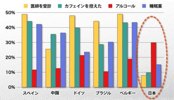 お気づきの通り、多くの国では「医師を受診」「カフェインを控えた」といった対処法を取る人の割合が多いのに対し(※「睡眠薬」の割合も多いですが……)、日本人は「アルコール」に頼る傾向が顕著です。